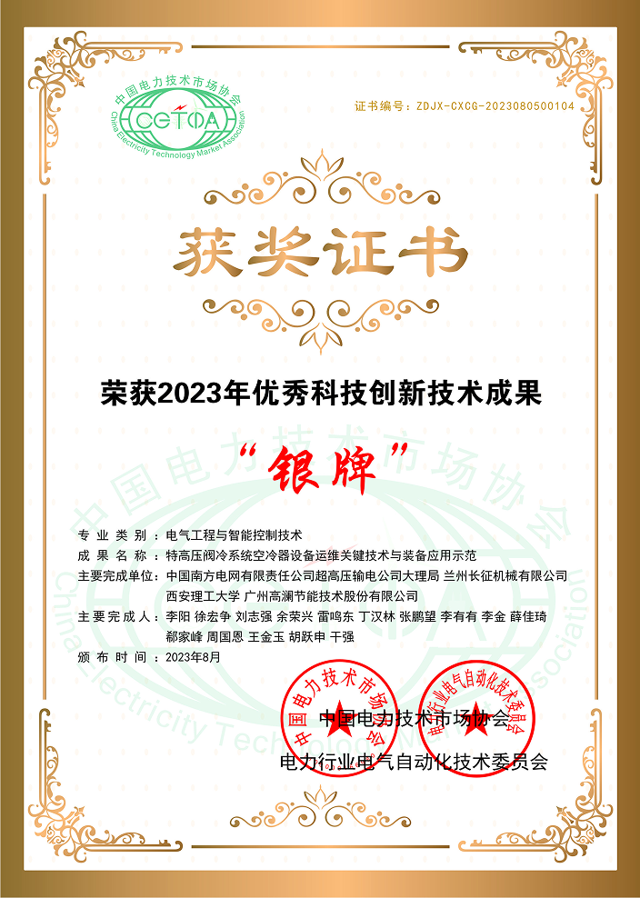 中國電力技術市場協會、電力行業電氣自動化技術委員會2023年優秀科技創新技術成果“銀牌”